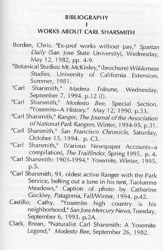 Pages below are from Sharsmith, John and Shields, Allan, 1996, Climb Every Mountain: A Portrait of Carl Sharsmith. Jerseydale Ranch Press: Mariposa, CA. Pages xiv-xxiv. Permission to reproduce this bibliography on the website name4carl.org received from Allan Shields, 4/20/06.
