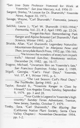 Sharsmith, John and Shields, Allan, 1996, Climb Every Mountain: A Portrait of Carl Sharsmith. Jerseydale Ranch Press: Mariposa, CA. Written by Carl Sharsmith's son and a fellow Tuolumne Meadows naturalist. Includes testimonials by admirers at memorial service following Carl's death.