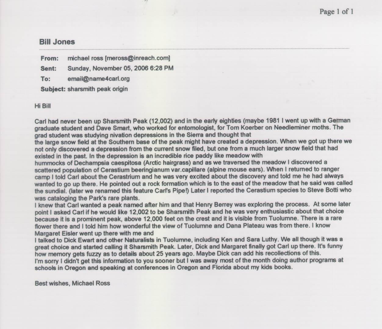 How Peak 12,002 became known as Sharsmith Peak, email from Michael Ross dated November 5, 2006