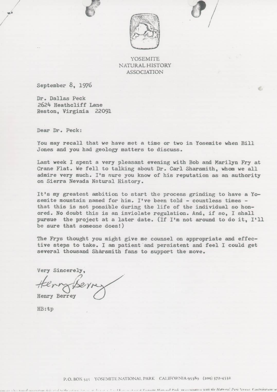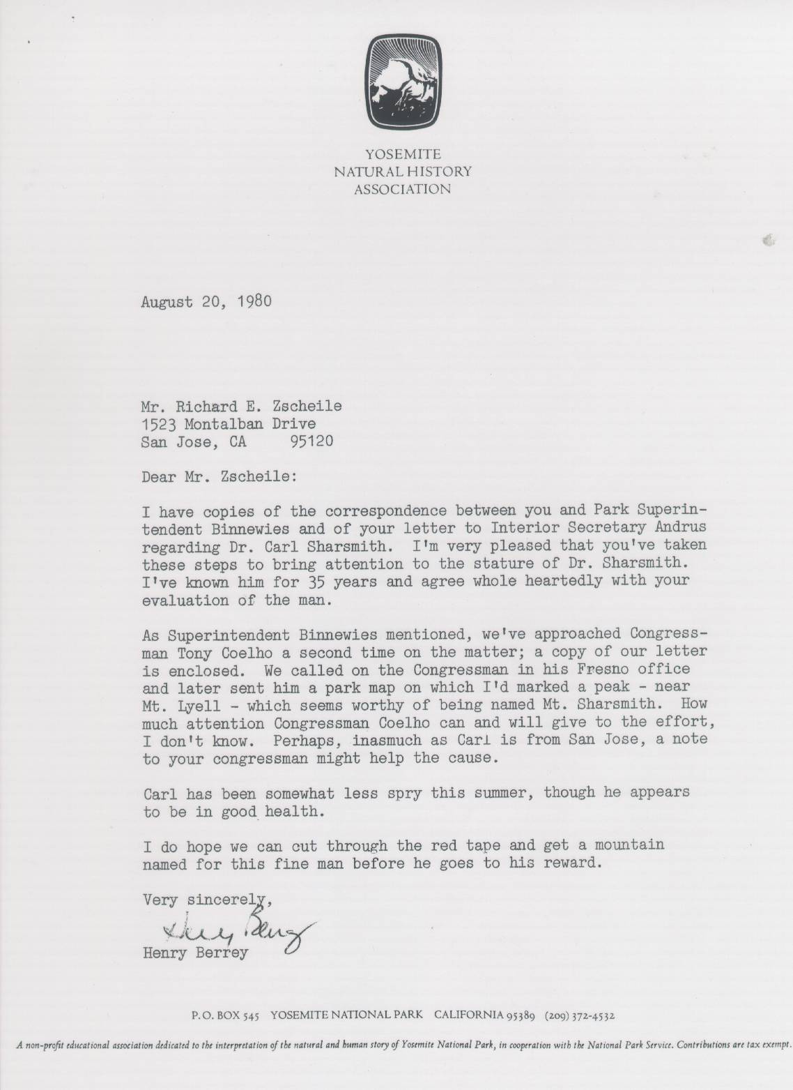yosemite Association. Successor to Yosemite Natural History Association. This is the cooperating association for Yosemite National Park, operating under an agreement with the National Park Service to provide support to the interpretive program of the park. Henry Berrey managed the Association from circa 1970 until circa 1985. Henry had first had a career in the publicity/marketing/media relations function of the Yosemite park concessioner for many years. Steve Medley then took on that role until his death in 2006. Steve had worked as a ranger and librarian at the park and was an attorney. The Association has over 10,000 members.