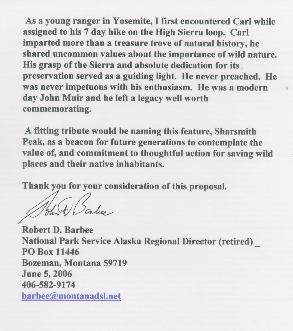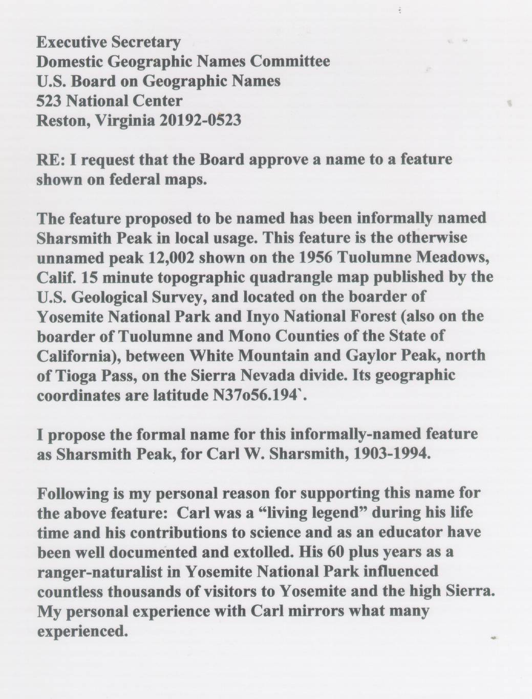 Home & Synopsis/Status Reports Purpose & Method Who was Carl Sharsmith? Why name a Yosemite feature for Carl?/Origin of Proposal Which feature should be named for Carl? How can a feature be named for Carl? SUMMARY OF SUPPORTING STATEMENTS Contacts/Resources Webmaster Search Form