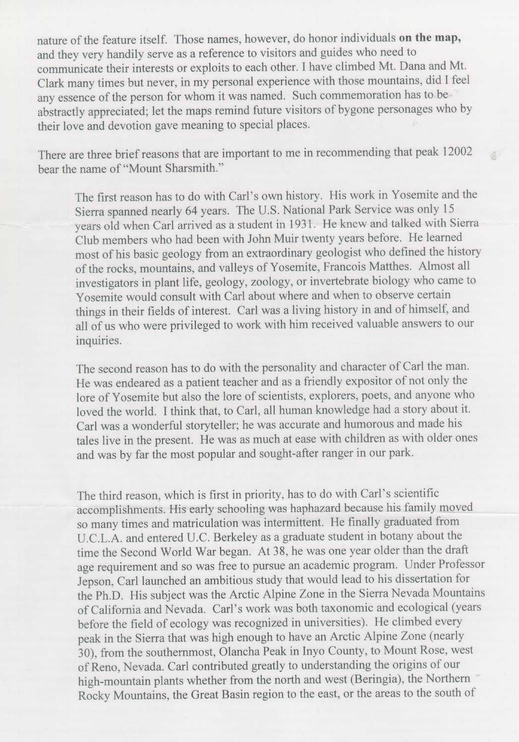 Home & Synopsis/Status Reports Purpose & Method Who was Carl Sharsmith? Why name a Yosemite feature for Carl?/Origin of Proposal Which feature should be named for Carl? How can a feature be named for Carl? SUMMARY OF SUPPORTING STATEMENTS Contacts/Resources Webmaster Search Form