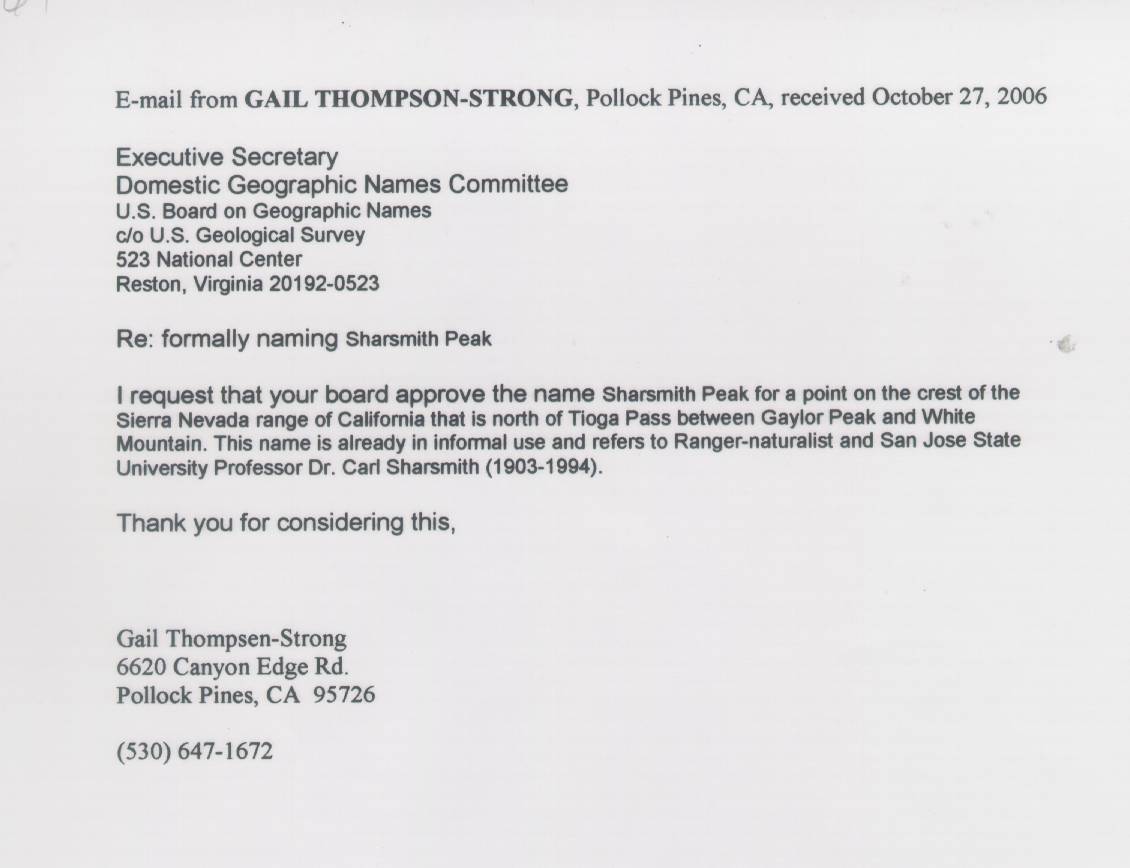 Home & Synopsis/Status Reports Purpose & Method Who was Carl Sharsmith? Why name a Yosemite feature for Carl?/Origin of Proposal Which feature should be named for Carl? How can a feature be named for Carl? SUMMARY OF SUPPORTING STATEMENTS Contacts/Resources Webmaster Search Form