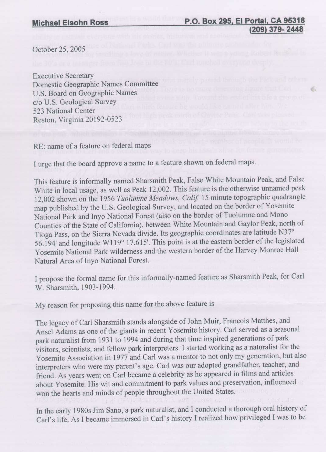 Home & Synopsis/Status Reports Purpose & Method Who was Carl Sharsmith? Why name a Yosemite feature for Carl?/Origin of Proposal Which feature should be named for Carl? How can a feature be named for Carl? SUMMARY OF SUPPORTING STATEMENTS Contacts/Resources Webmaster Search Form