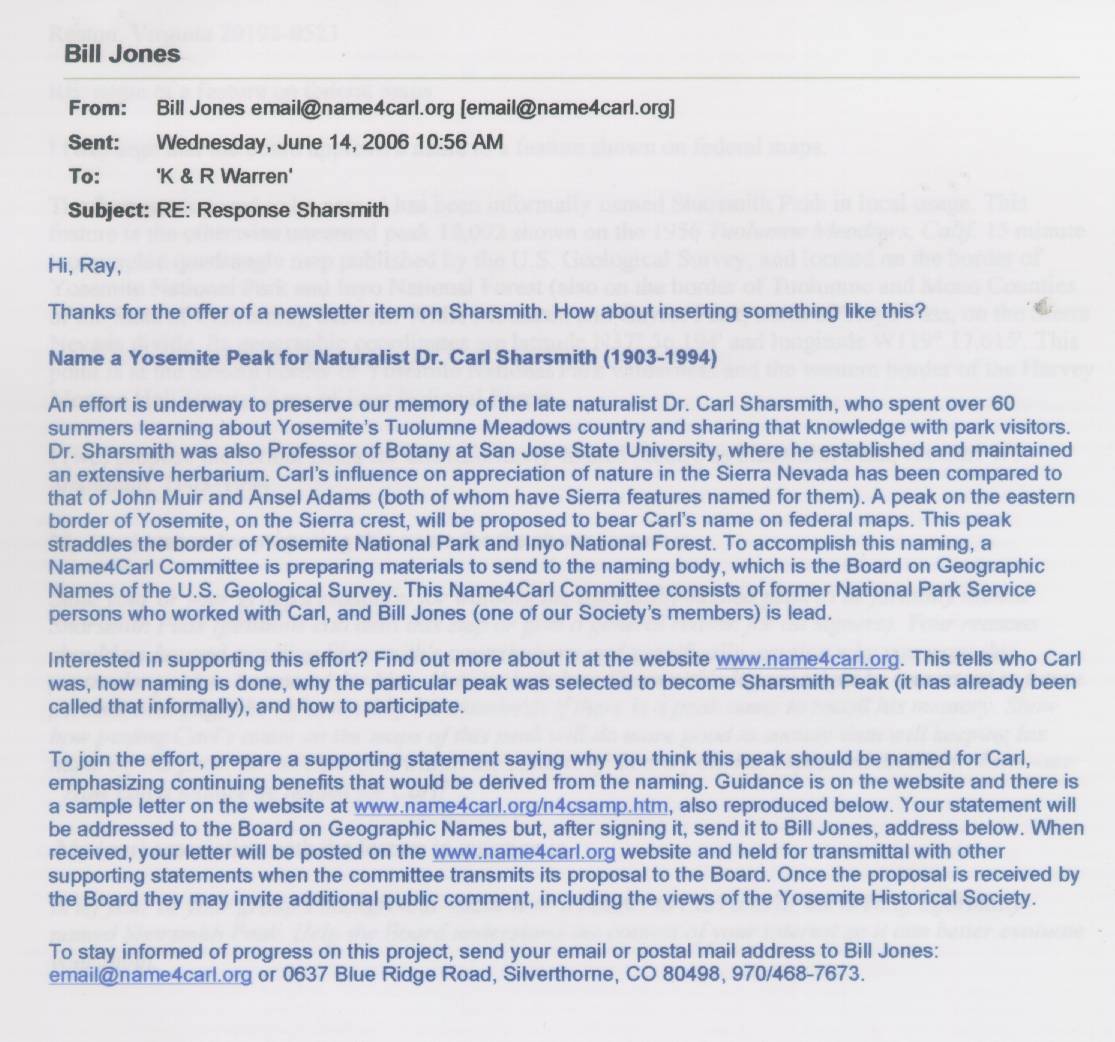 Home & Synopsis/Status Reports Purpose & Method Who was Carl Sharsmith? Why name a Yosemite feature for Carl?/Origin of Proposal Which feature should be named for Carl? How can a feature be named for Carl? SUMMARY OF SUPPORTING STATEMENTS Contacts/Resources Webmaster Search Form