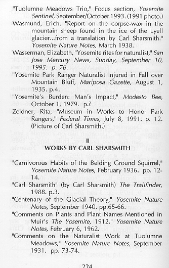 Sharsmith, John and Shields, Allan, 1996, Climb Every Mountain: A Portrait of Carl Sharsmith. Jerseydale Ranch Press: Mariposa, CA. Written by Carl Sharsmith's son and a fellow Tuolumne Meadows naturalist. Includes testimonials by admirers at memorial service following Carl's death.