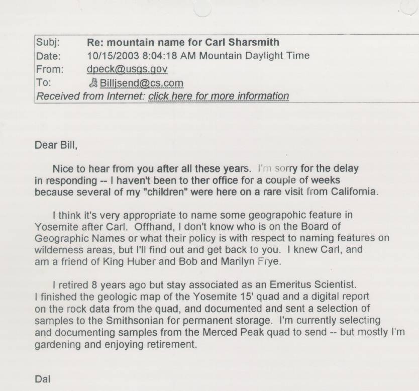 Home & Synopsis/Status Reports Purpose & Method Who was Carl Sharsmith? Why name a Yosemite feature for Carl?/Origin of Proposal Which feature should be named for Carl? How can a feature be named for Carl? SUMMARY OF SUPPORTING STATEMENTS Contacts/Resources Webmaster Search Form