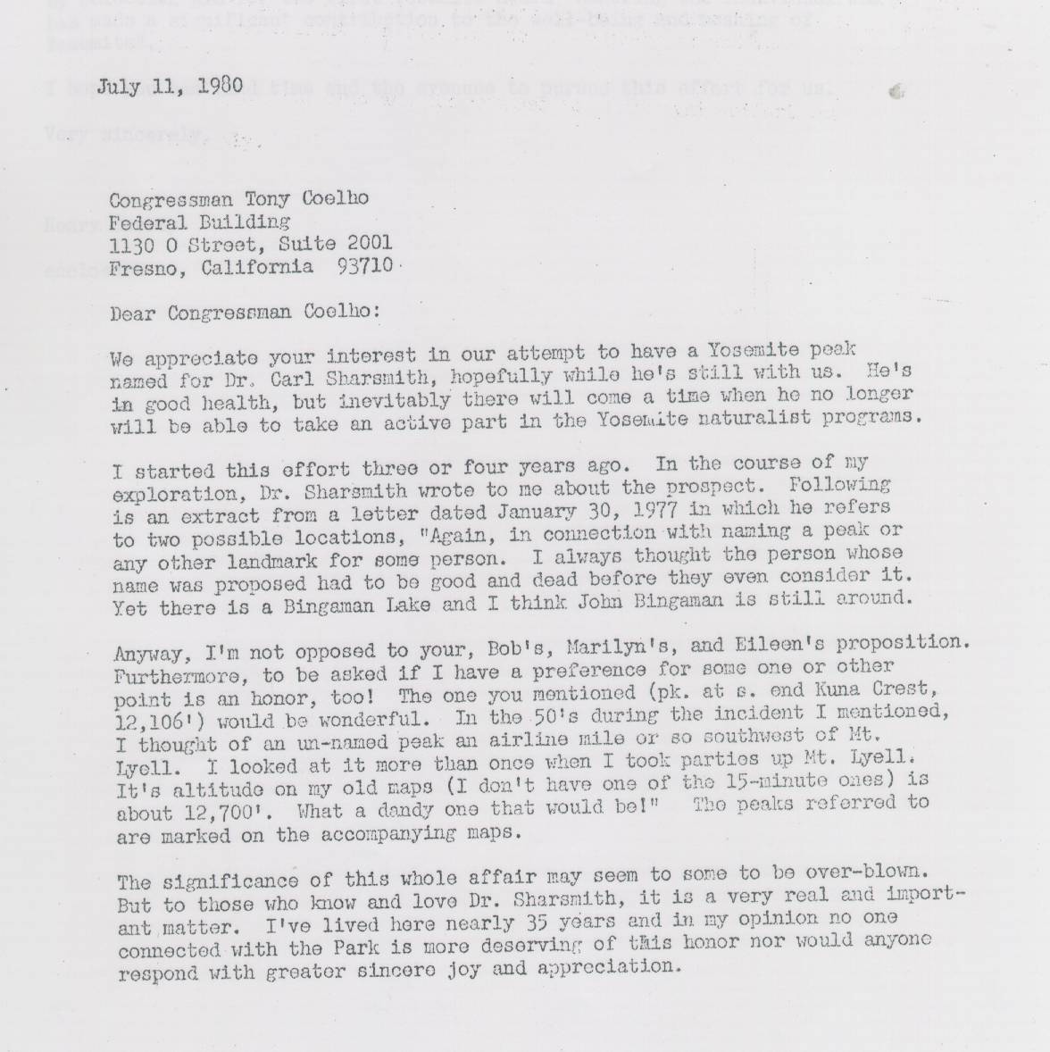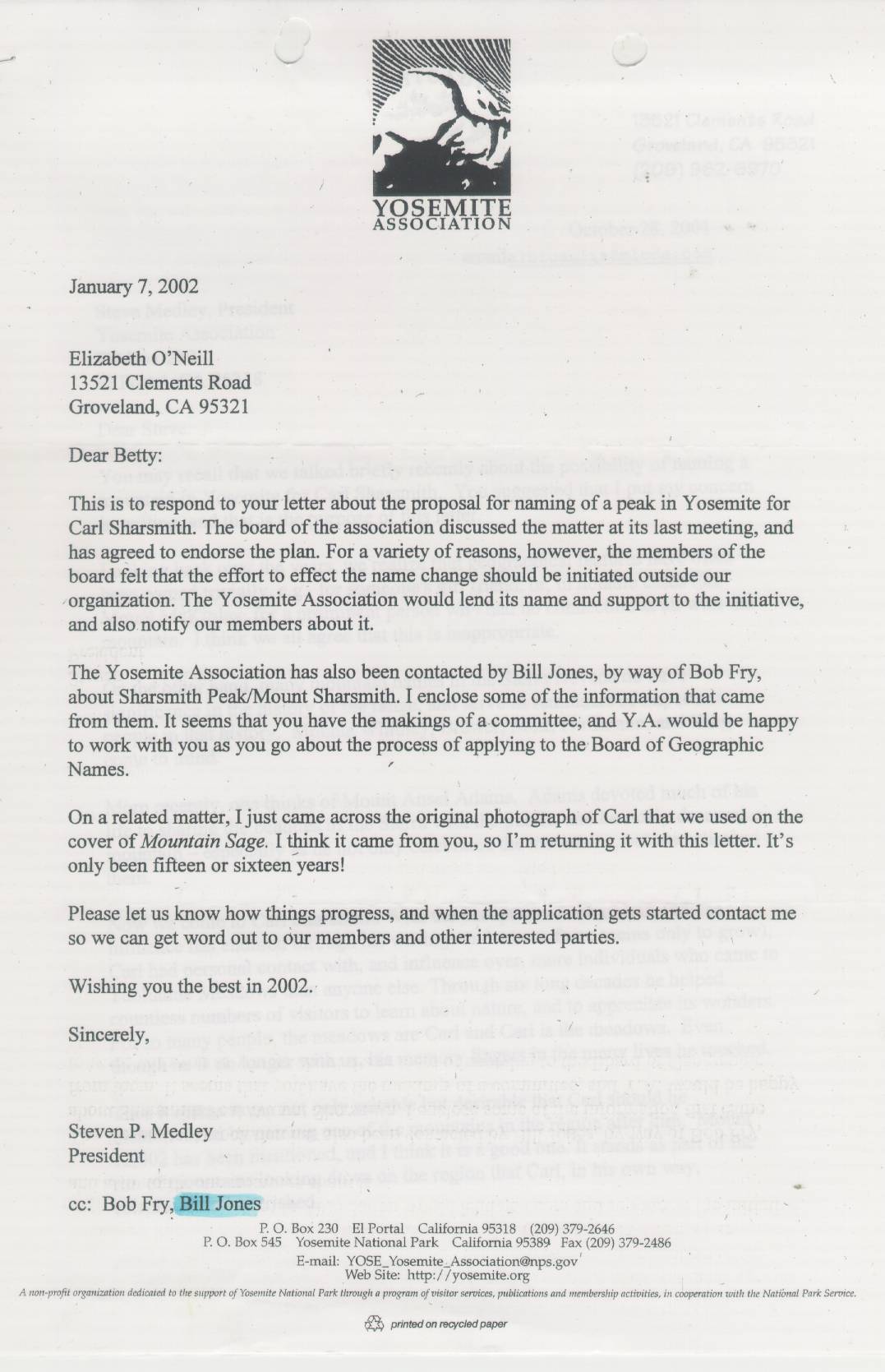 ACTION OF BOARD AT MEETING OF SEPTEMBER 9, 2006: At its annual meeting the Board of Directors of the Yosemite Association endorsed the Sharsmith Peak naming proposal, as confirmed by President Steve Medley. Mr. Medley died not long after, however, and thus a delay occurred until the following letter was prepared.