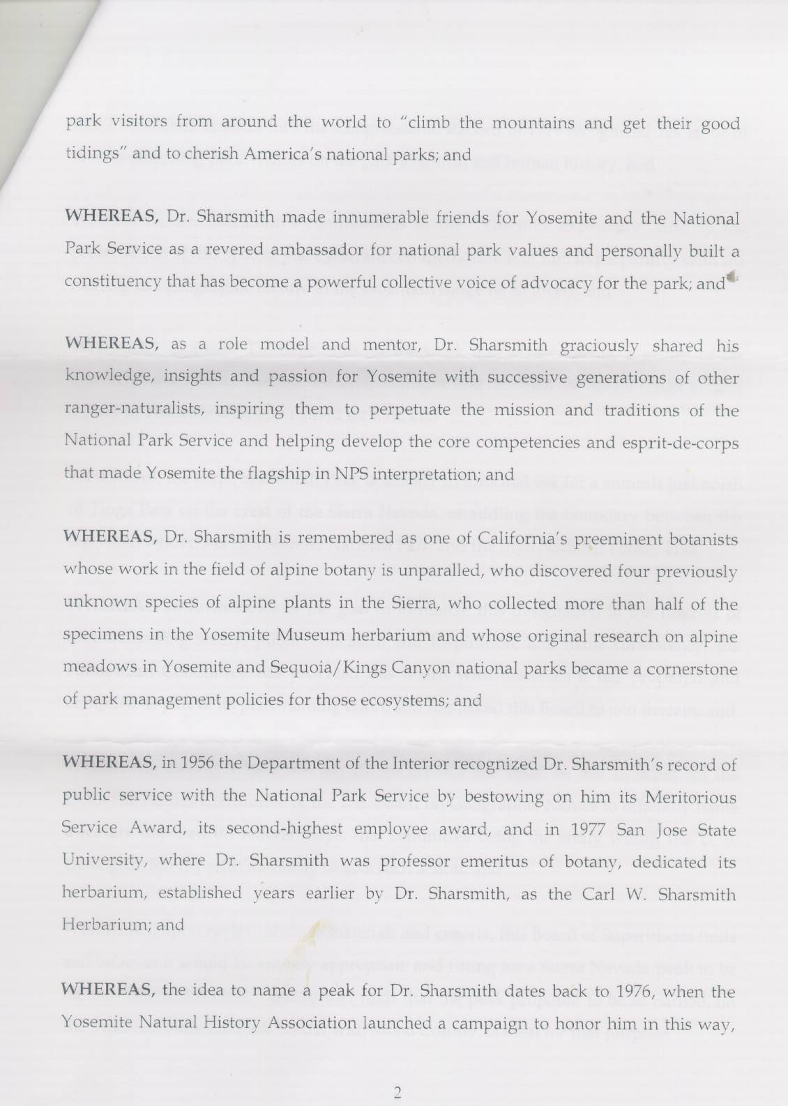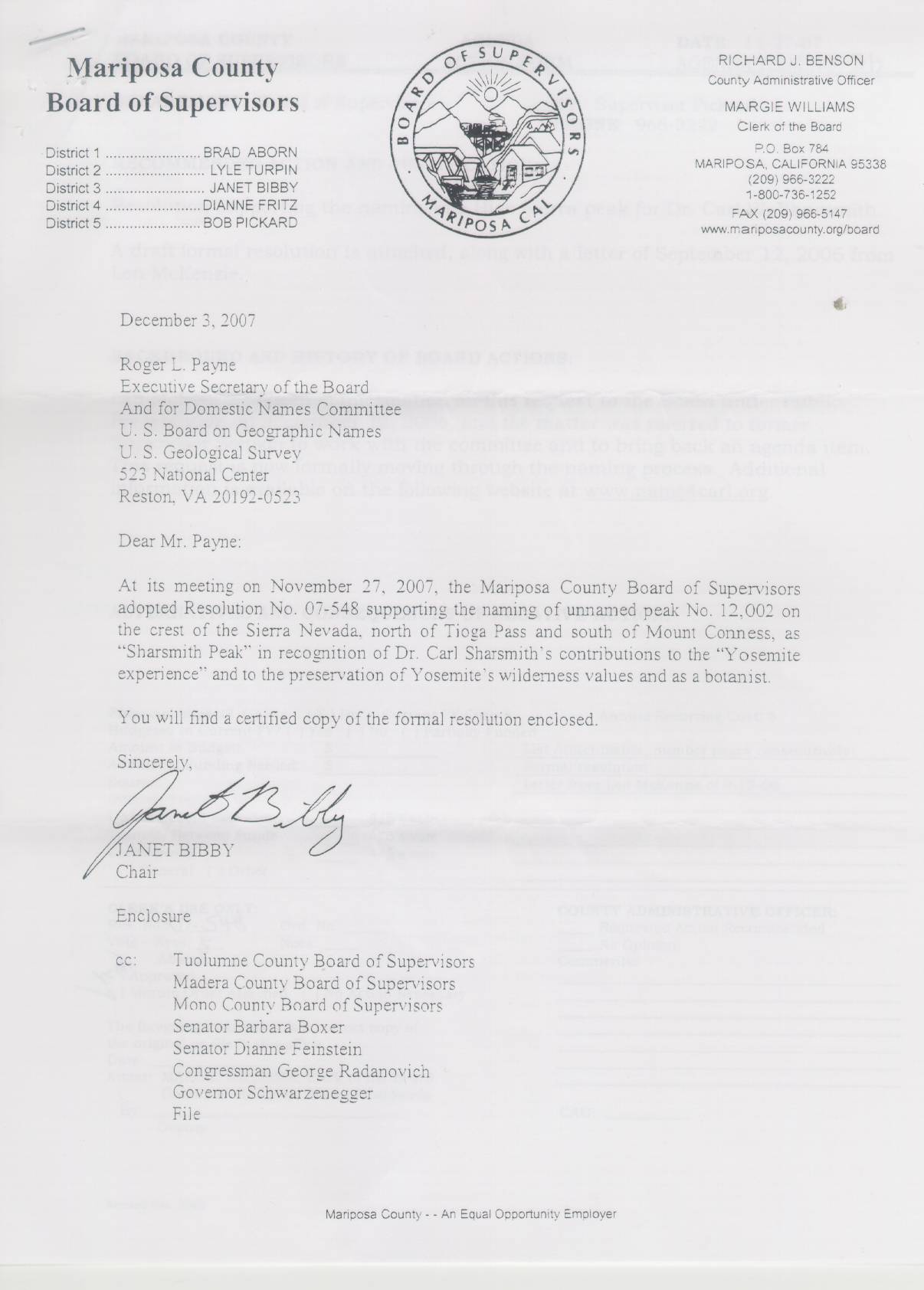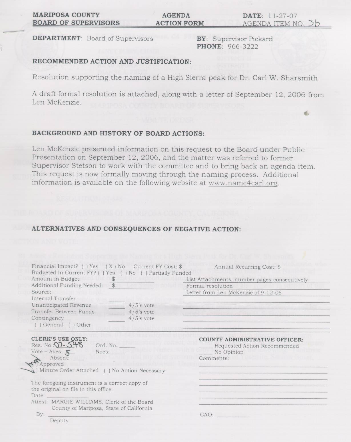 Resolution 07-548 dated November 27, 2007 endorsing official naming of Sharsmith Peak by the U.S. Board on Geographic Names.