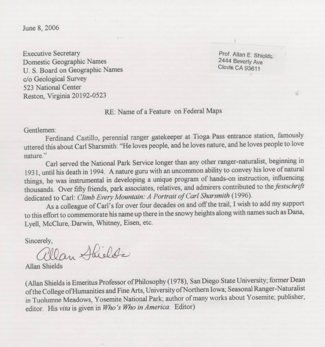 Home & Synopsis/Status Reports Purpose & Method Who was Carl Sharsmith? Why name a Yosemite feature for Carl?/Origin of Proposal Which feature should be named for Carl? How can a feature be named for Carl? SUMMARY OF SUPPORTING STATEMENTS Contacts/Resources Webmaster Search Form