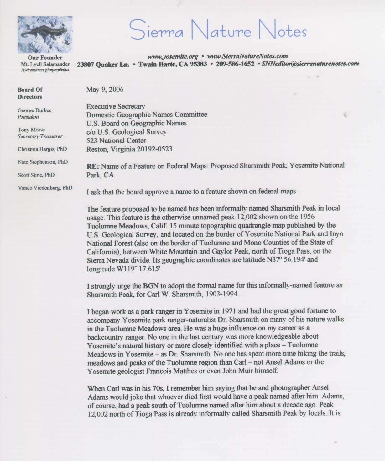 Home & Synopsis/Status Reports Purpose & Method Who was Carl Sharsmith? Why name a Yosemite feature for Carl?/Origin of Proposal Which feature should be named for Carl? How can a feature be named for Carl? SUMMARY OF SUPPORTING STATEMENTS Contacts/Resources Webmaster Search Form