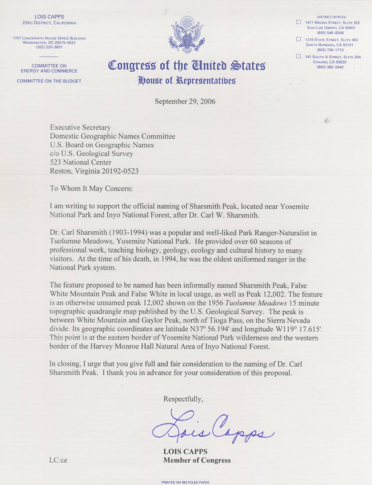 Lois Capps. Member of Congress, U.S. House of Representatives, California, 23RD DISTRICT. Based in Santa Barbara, California