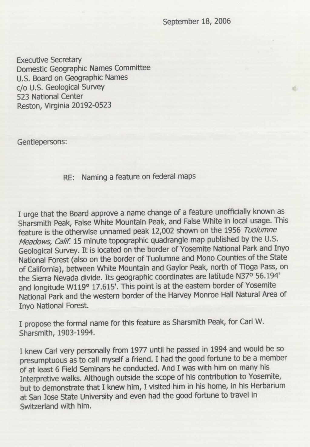 Home & Synopsis/Status Reports Purpose & Method Who was Carl Sharsmith? Why name a Yosemite feature for Carl?/Origin of Proposal Which feature should be named for Carl? How can a feature be named for Carl? SUMMARY OF SUPPORTING STATEMENTS Contacts/Resources Webmaster Search Form