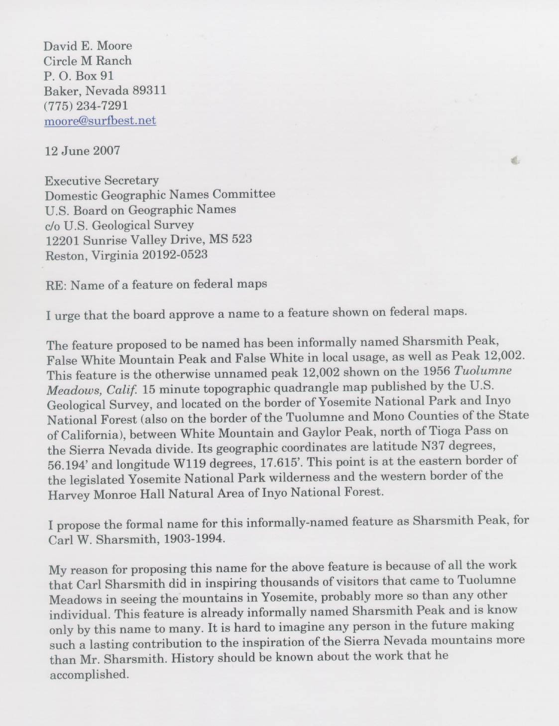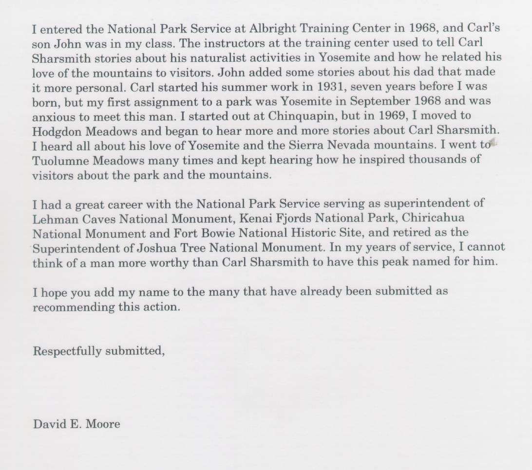 Home & Synopsis/Status Reports Purpose & Method Who was Carl Sharsmith? Why name a Yosemite feature for Carl?/Origin of Proposal Which feature should be named for Carl? How can a feature be named for Carl? SUMMARY OF SUPPORTING STATEMENTS Contacts/Resources Webmaster Search Form
